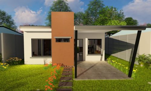 El Modelo 3, esta integrado por: Un espacio sin divisiones para sala, comedor y cocina. Dos dormitorios, y un baño. Se realiza una extensión del techo en la zona trasera de la vivienda, para ubicar la zona de lavandería. Además, se propone una cochera integrada, en la zona frontal de la vivienda.